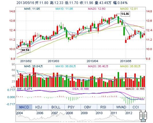 | 今 開: | 11.80 | 成交量: | 43.49萬手 | 振 幅: | 5.31% |