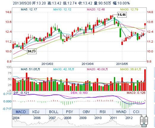 | 今 開: | 13.20 | 成交量: | 90.50萬手 | 振 幅: | 5.57% |