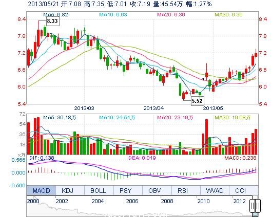 今開: 7.08 成交量: 45.54萬(wan) 手 振幅: 4.79% 最高: 7.35 成交額: 3.27億(yi) 元 換手率: 5.11% 最低: 7.01 總市值: 64.07億(yi) 市淨率: 2.44 昨收: 7.10 流通市值: 64...