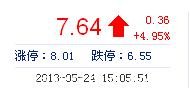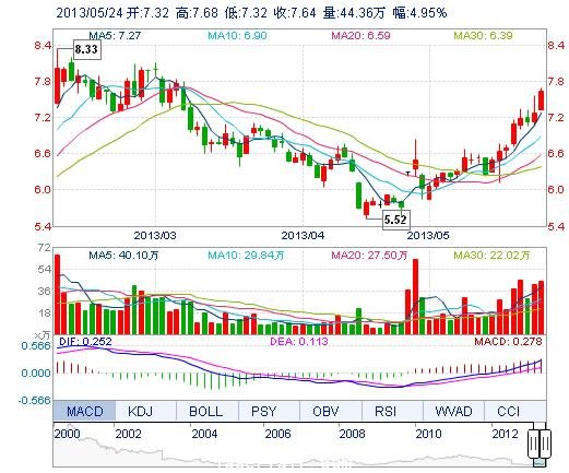 今開: 7.32 成交量: 44.36萬(wan) 手 振幅: 4.95% 最高: 7.68 成交額: 3.33億(yi) 元 換手率: 4.98% 最低: 7.32 總市值: 68.08億(yi) 市淨率: 2.59 昨收: 7.28 流通市值: 68...