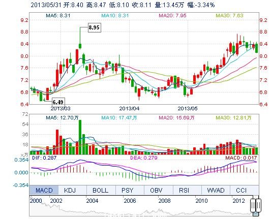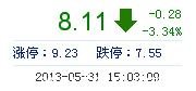 今開: 8.40 成交量: 13.45萬(wan) 手 振幅: 4.41% 最高: 8.47 成交額: 1.11億(yi) 元 換手率: 3.08% 最低: 8.10 總市值: 35.42億(yi) 市淨率: 2.53 昨收: 8.39 流通市值: 35...