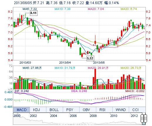 今開: 7.21 成交量: 14.60萬(wan) 手 振幅: 2.77% 最高: 7.36 成交額: 1.06億(yi) 元 換手率: 1.64% 最低: 7.16 總市值: 64.34億(yi) 市淨率: 2.45 昨收: 7.21 流通市值: 64...