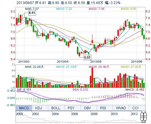 | 今 開: | 6.81 | 成交量: | 15.48萬手 | 振 幅: | 5.87% |