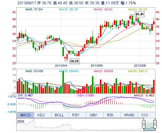 今開: 38.70 成交量: 11.08萬(wan) 手 振幅: 5.04% 最高: 40.45 成交額: 4.38億(yi) 元 換手率: 3.86% 最低: 38.50 總市值: 117.25億(yi) 市淨率: 8.20 昨收: 38.71 流通市值...