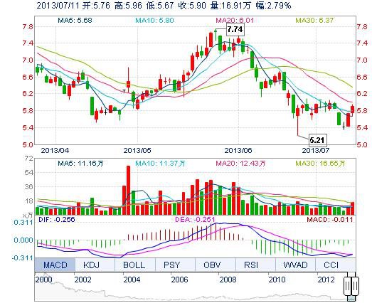 今開: 5.76 成交量: 16.91萬(wan) 手 振幅: 5.05% 最高: 5.96 成交額: 9877.34萬(wan) 元 換手率: 1.90% 最低: 5.67 總市值: 52.58億(yi) 市淨率: 2.00 昨收: 5.74 流通市值:...