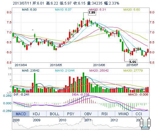 今開: 6.01 成交量: 3.42萬(wan) 手 振幅: 4.16% 最高: 6.22 成交額: 2091.06萬(wan) 元 換手率: 1.25% 最低: 5.97 總市值: 17.53億(yi) 市淨率: 2.79 昨收: 6.01 流通市值: ...