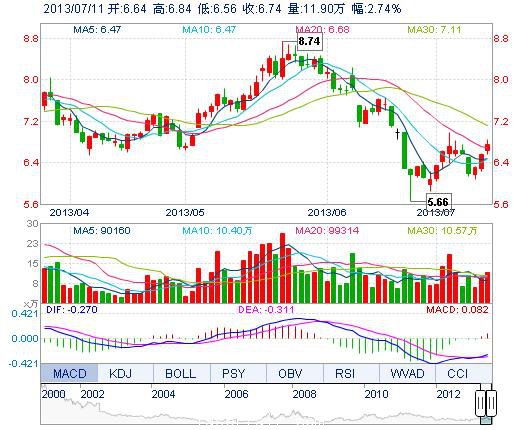 | 今 開: | 6.64 | 成交量: | 11.90萬手 | 振 幅: | 4.27% |