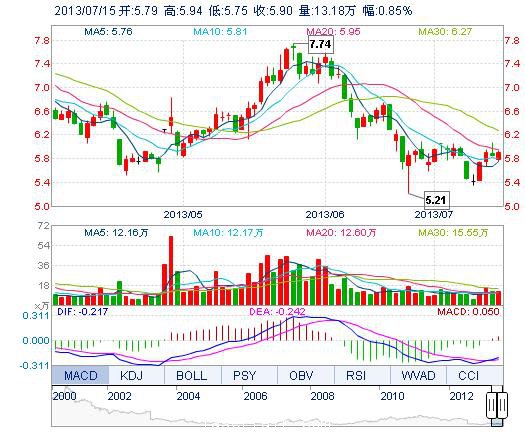 今開: 5.79 成交量: 13.18萬(wan) 手 振幅: 3.25% 最高: 5.94 成交額: 7718.16萬(wan) 元 換手率: 1.48% 最低: 5.75 總市值: 52.58億(yi) 市淨率: 2.00 昨收: 5.85 流通市值:...