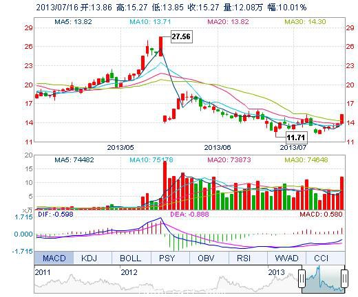 | 今 開: | 13.86 | 成交量: | 12.08萬手 | 振 幅: | 10.23% |
