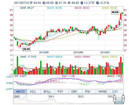 今開: 49.50 成交量: 12.37萬(wan) 手 振幅: 4.86% 最高: 49.68 成交額: 5.99億(yi) 元 換手率: 4.31% 最低: 47.30 總市值: 145.26億(yi) 市淨率: 10.16 昨收: 48.95 流通市...