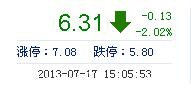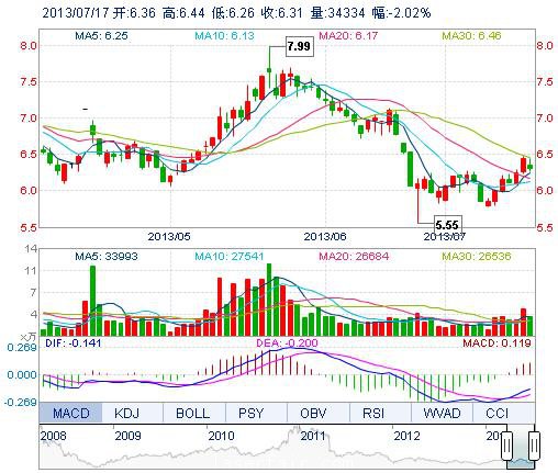 | 今 開: | 6.36 | 成交量: | 3.43萬手 | 振 幅: | 2.80% |