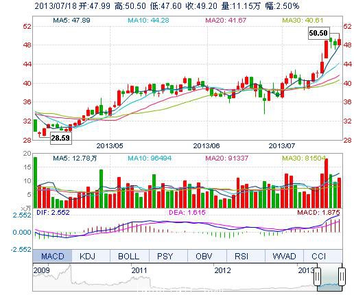 今開: 47.99 成交量: 11.15萬(wan) 手 振幅: 6.04% 最高: 50.50 成交額: 5.50億(yi) 元 換手率: 3.88% 最低: 47.60 總市值: 146.45億(yi) 市淨率: 10.24 昨收: 48.00 流通市...