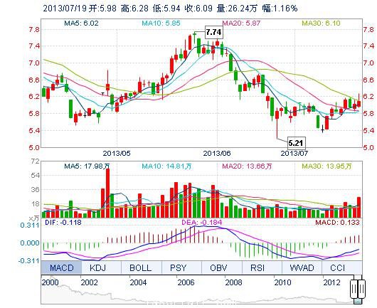 今開: 5.98 成交量: 26.24萬(wan) 手 振幅: 5.65% 最高: 6.28 成交額: 1.61億(yi) 元 換手率: 2.94% 最低: 5.94 總市值: 54.27億(yi) 市淨率: 2.07 昨收: 6.02 流通市值: 54...