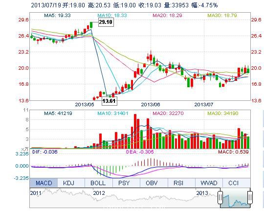 今開: 19.80 成交量: 3.40萬(wan) 手 振幅: 7.66% 最高: 20.53 成交額: 6731.43萬(wan) 元 換手率: 15.79% 最低: 19.00 總市值: 13.32億(yi) 市淨率: 2.33 昨收: 19.98 流通市...