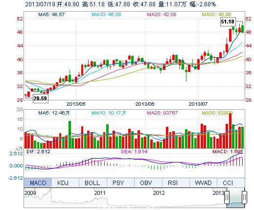 今開: 49.90 成交量: 11.07萬(wan) 手 振幅: 6.71% 最高: 51.18 成交額: 5.48億(yi) 元 換手率: 3.85% 最低: 47.88 總市值: 142.52億(yi) 市淨率: 9.97 昨收: 49.20 流通市值...