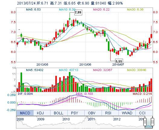 今開: 6.71 成交量: 8.10萬(wan) 手 振幅: 9.85% 最高: 7.31 成交額: 5621.77萬(wan) 元 換手率: 2.95% 最低: 6.65 總市值: 19.67億(yi) 市淨率: 3.13 昨收: 6.70 流通市值: ...