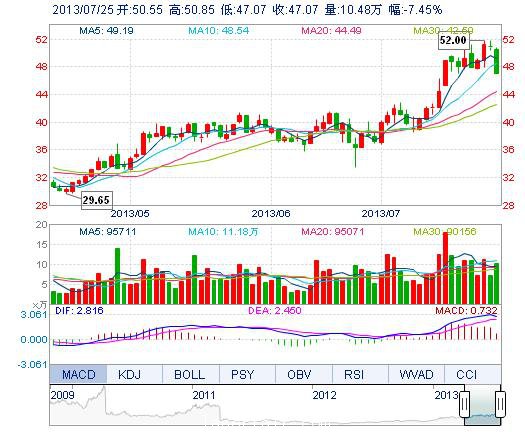 今開: 50.55 成交量: 10.48萬(wan) 手 振幅: 7.43% 最高: 50.85 成交額: 5.08億(yi) 元 換手率: 3.65% 最低: 47.07 總市值: 140.11億(yi) 市淨率: 9.80 昨收: 50.86 流通市值...