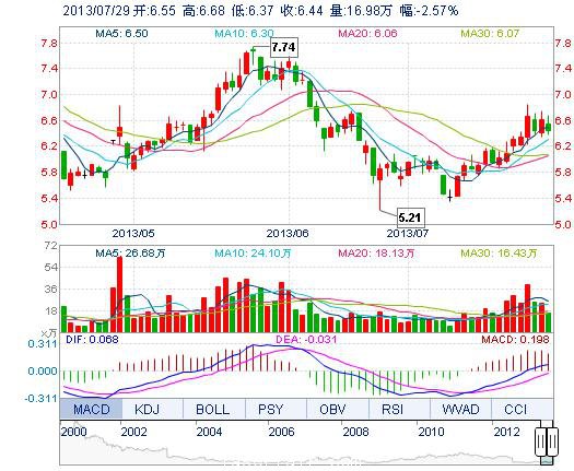 今開: 6.55 成交量: 16.98萬(wan) 手 振幅: 4.69% 最高: 6.68 成交額: 1.10億(yi) 元 換手率: 1.91% 最低: 6.37 總市值: 57.39億(yi) 市淨率: 2.19 昨收: 6.61 流通市值: 57...