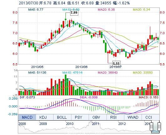 今開: 6.78 成交量: 3.49萬(wan) 手 振幅: 4.85% 最高: 6.84 成交額: 2323.63萬(wan) 元 換手率: 1.27% 最低: 6.51 總市值: 19.07億(yi) 市淨率: 3.03 昨收: 6.80 流通市值: ...
