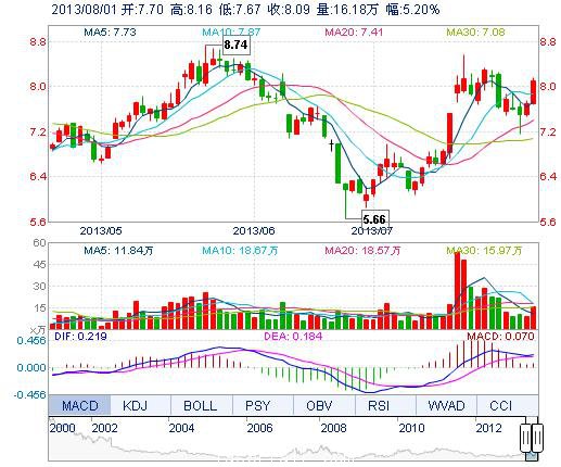 今開: 7.70 成交量: 16.18萬(wan) 手 振幅: 6.37% 最高: 8.16 成交額: 1.29億(yi) 元 換手率: 3.70% 最低: 7.67 總市值: 35.34億(yi) 市淨率: 2.52 昨收: 7.69 流通市值: 35...