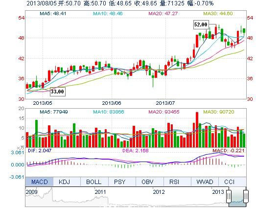 今開: 50.70 成交量: 7.13萬(wan) 手 振幅: 4.10% 最高: 50.70 成交額: 3.52億(yi) 元 換手率: 2.48% 最低: 48.65 總市值: 147.79億(yi) 市淨率: 9.90 昨收: 50.00 流通市值...