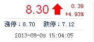 今開: 7.87 成交量: 33.34萬(wan) 手 振幅: 10.75% 最高: 8.70 成交額: 2.81億(yi) 元 換手率: 7.63% 最低: 7.85 總市值: 36.25億(yi) 市淨率: 2.59 昨收: 7.91 流通市值: 3...