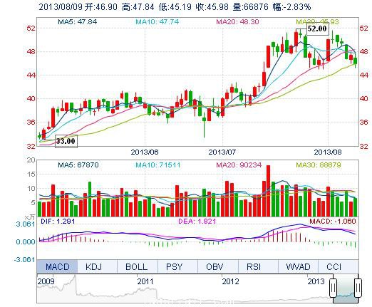 今開: 46.90 成交量: 6.69萬(wan) 手 振幅: 5.60% 最高: 47.84 成交額: 3.08億(yi) 元 換手率: 2.33% 最低: 45.19 總市值: 136.86億(yi) 市淨率: 9.17 昨收: 47.32 流通市值...