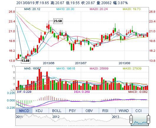 今開: 19.65 成交量: 2.07萬(wan) 手 振幅: 5.63% 最高: 20.67 成交額: 4193.64萬(wan) 元 換手率: 9.61% 最低: 19.55 總市值: 14.47億(yi) 市淨率: 2.53 昨收: 19.90 流通市...