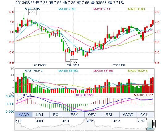 今開: 7.38 成交量: 9.37萬(wan) 手 振幅: 4.06% 最高: 7.66 成交額: 7083.72萬(wan) 元 換手率: 3.41% 最低: 7.36 總市值: 21.63億(yi) 市淨率: 3.53 昨收: 7.39 流通市值: ...