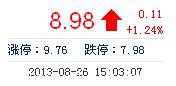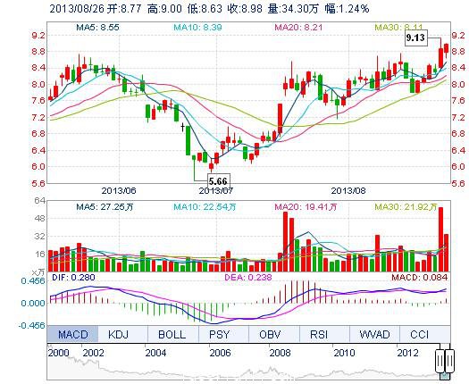今開: 8.77 成交量: 34.30萬(wan) 手 振幅: 4.17% 最高: 9.00 成交額: 3.01億(yi) 元 換手率: 7.85% 最低: 8.63 總市值: 39.22億(yi) 市淨率: 2.80 昨收: 8.87 流通市值: 39...