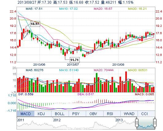 今開: 17.30 成交量: 4.62萬(wan) 手 振幅: 4.91% 最高: 17.53 成交額: 7909.91萬(wan) 元 換手率: 6.75% 最低: 16.68 總市值: 23.48億(yi) 市淨率: 7.34 昨收: 17.32 流通市...