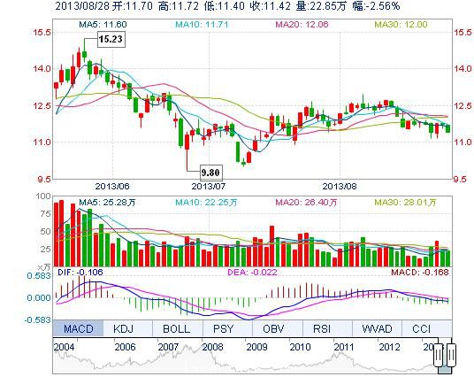 今開: 11.70 成交量: 22.85萬(wan) 手 振幅: 2.73% 最高: 11.72 成交額: 2.64億(yi) 元 換手率: 2.42% 最低: 11.40 總市值: 119.27億(yi) 市淨率: 3.56 昨收: 11.72 流通市值...