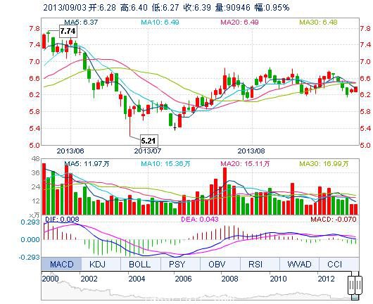 今開: 6.28 成交量: 9.09萬(wan) 手 振幅: 2.05% 最高: 6.40 成交額: 5776.55萬(wan) 元 換手率: 1.02% 最低: 6.27 總市值: 56.94億(yi) 市淨率: 2.17 昨收: 6.33 流通市值: ...
