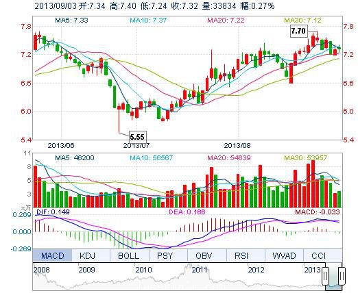 | 今 開: | 7.34 | 成交量: | 3.38萬手 | 振 幅: | 2.19% |