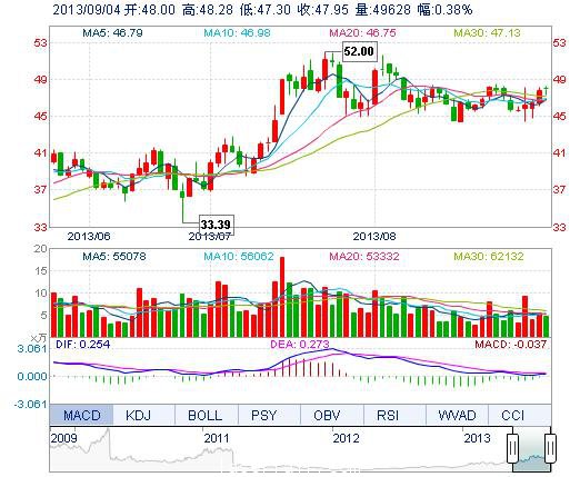 | 最 高: | 48.28 | 成交額: | 2.38億元 | 換手率: | 1.73% |