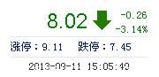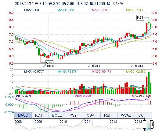 今開: 8.19 成交量: 9.10萬(wan) 手 振幅: 4.35% 最高: 8.26 成交額: 7318.13萬(wan) 元 換手率: 3.31% 最低: 7.90 總市值: 22.86億(yi) 市淨率: 3.73 昨收: 8.28 流通市值: ...
