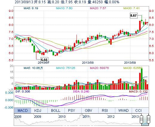 | 今 開: | 8.15 | 成交量: | 4.62萬手 | 振 幅: | 3.05% |