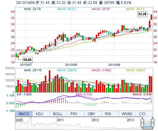 今開: 31.45 成交量: 3.98萬(wan) 手 振幅: 5.63% 最高: 33.20 成交額: 1.29億(yi) 元 換手率: 1.17% 最低: 31.45 總市值: 142.25億(yi) 市淨率: 9.25 昨收: 31.07 流通市值...