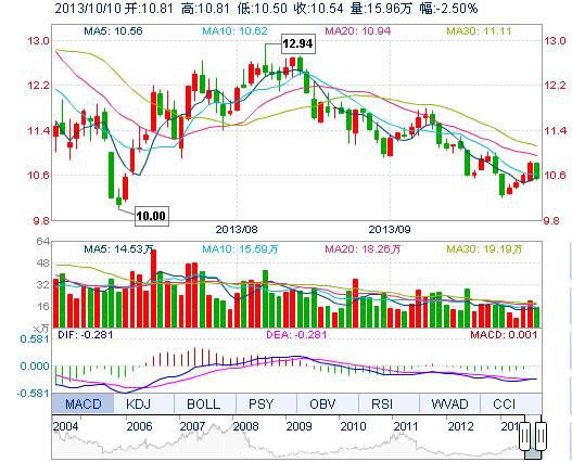 | 今 開: | 10.81 | 成交量: | 15.96萬手 | 振 幅: | 2.87% |