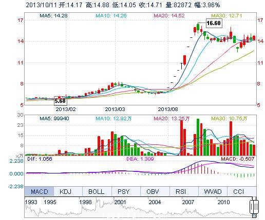 | 最 高: | 14.88 | 成交額: | 1.20億元 | 換手率: | 4.77% |