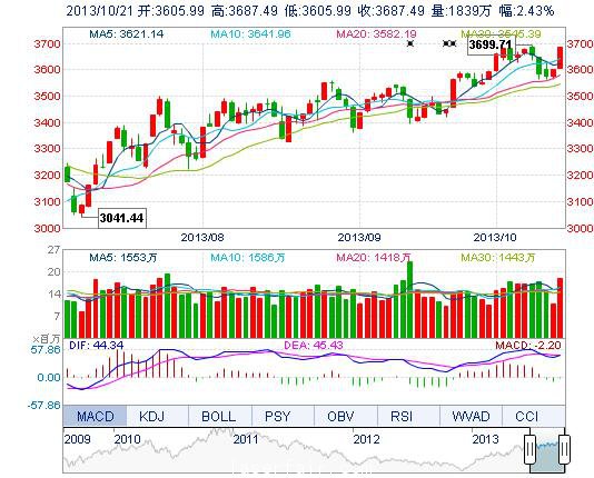 今開: 3605.99 最高: 3687.49 昨收: 3600.13 最低: 3605.99 成交量: 1838.83萬(wan) 手 振幅: 2.26% 成交額: 221.32億(yi) 元