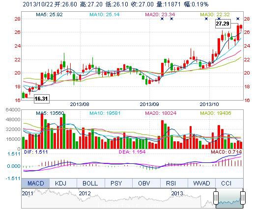 | 今 開: | 26.60 | 成交量: | 1.19萬手 | 振 幅: | 4.08% |
