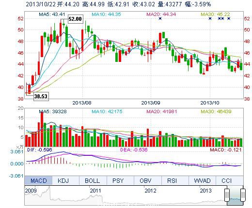 今開: 44.20 成交量: 4.33萬(wan) 手 振幅: 4.66% 最高: 44.99 成交額: 1.90億(yi) 元 換手率: 1.51% 最低: 42.91 總市值: 128.05億(yi) 市淨率: 8.58 昨收: 44.62 流通市值...
