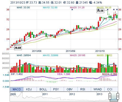 今開: 33.73 成交量: 2.13萬(wan) 手 振幅: 7.45% 最高: 34.55 成交額: 7066.41萬(wan) 元 換手率: 0.63% 最低: 32.01 總市值: 141.04億(yi) 市淨率: 9.17 昨收: 34.08 流通市...
