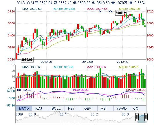 今開: 3529.94 最高: 3552.49 昨收: 3538.16 最低: 3508.33 成交量: 1078.08萬(wan) 手 振幅: 1.25% 成交額: 129.36億(yi) 元