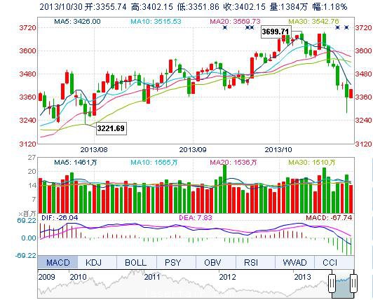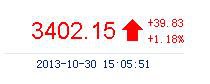 今開: 3355.74 最高: 3402.15 昨收: 3362.32 最低: 3351.86 成交量: 1383.87萬(wan) 手 振幅: 1.50% 成交額: 129.68億(yi) 元