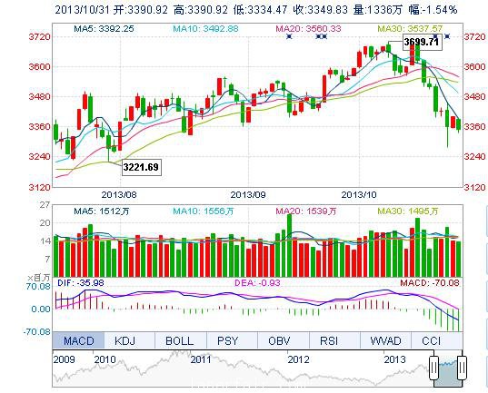 今開: 3390.92 最高: 3390.92 昨收: 3402.15 最低: 3334.47 成交量: 1336.23萬(wan) 手 振幅: 1.66% 成交額: 118.95億(yi) 元