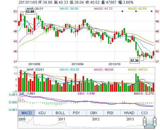 今開: 38.88 成交量: 4.79萬(wan) 手 振幅: 5.93% 最高: 40.33 成交額: 1.89億(yi) 元 換手率: 1.67% 最低: 38.04 總市值: 119.12億(yi) 市淨率: 7.84 昨收: 38.60 流通市值...