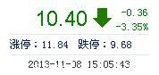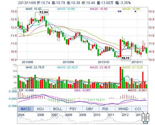 今開: 10.74 成交量: 13.00萬(wan) 手 振幅: 3.81% 最高: 10.79 成交額: 1.37億(yi) 元 換手率: 1.37% 最低: 10.38 總市值: 108.62億(yi) 市淨率: 3.11 昨收: 10.76 流通市值...