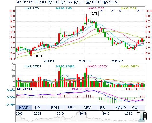 | 今 開: | 7.83 | 成交量: | 3.11萬手 | 振 幅: | 2.28% |